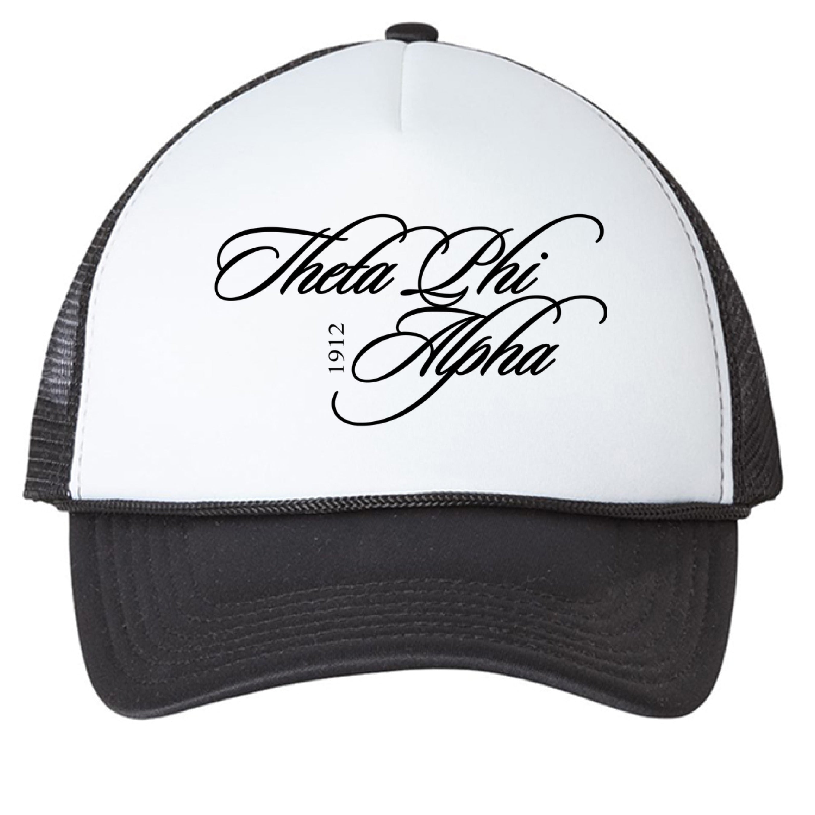 Cursive Theta Phi Alpha Black Trucker Hat